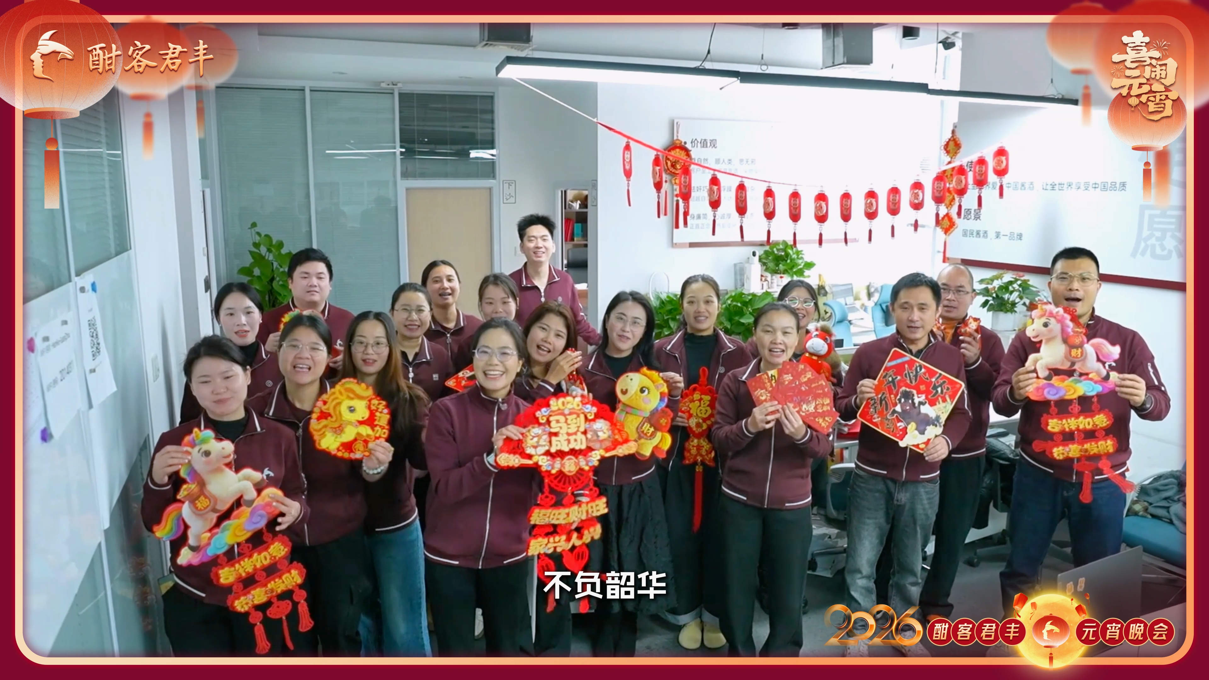 在一片欢声笑语中,酣客君丰王为、玄丽娜、佘小兵携酣客君丰一众高管向全体酣亲送出2026年的祝福,带着珍贵的回忆对未来许下崭新的期待。
